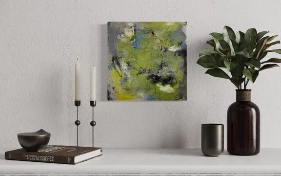Mixed Media On Panel, 12” x 12” x 1.5” (framed), $360